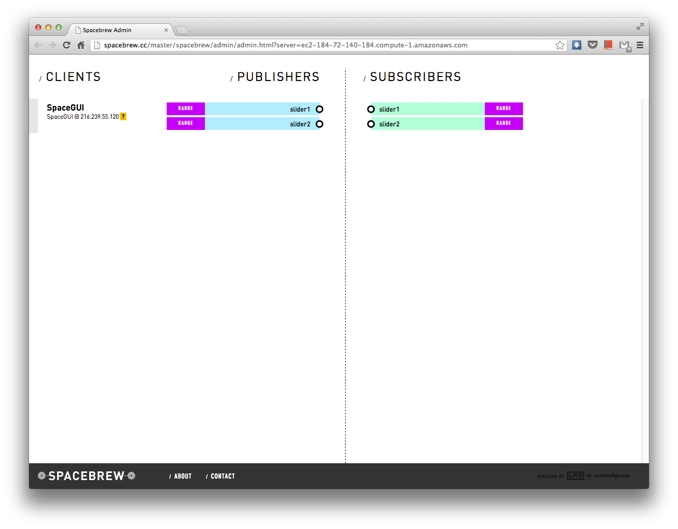 Note: if you do not see clients, publishers or subscribers on your admin page try it with another browser - we have mostly tested this with Chrome and have on occasion had issues with Safari and Firefox. You may see more clients if other users are connected to the public Spacebrew admin.
