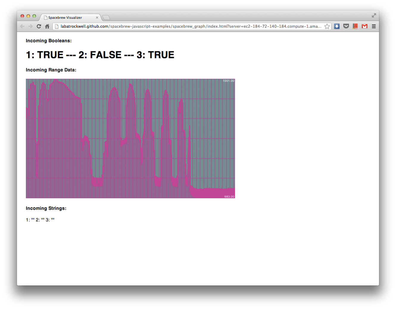 Since our photocell is publishing information in the form of a RANGE, we will need something that can interpret RANGE type information. We have a few examples we’ve put together than can do just that. The easiest one to launch is our Javascript Graph example. Click here to launch it in your browser - it is already set to point to the public Spacebrew cloud.